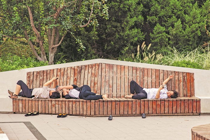 2023年8月23日下午5時,北京的一處公園內(nèi),附近餐廳的工作人員正在長凳上休息。本報記者 王偉偉 攝