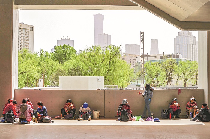 2023年4月11日,北京新工體建設(shè)現(xiàn)場,來自河北邯鄲的建筑女工在午休。本報記者 吳凡 攝