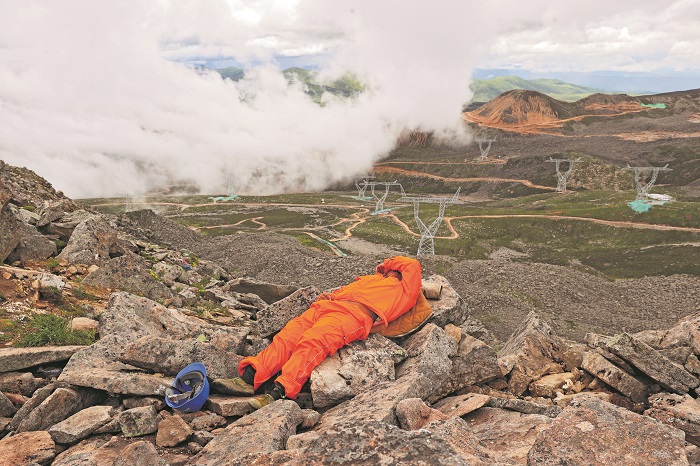 2024年7月16日,在四川省甘孜藏族自治州康定市折多山川渝1000千伏特高壓交流工程線路工程1R060號鐵塔組立現(xiàn)場,一名工人躺在石頭上午休。川渝1000千伏特高壓交流工程線路工程(2標段)全線平均海拔4224米,是連接四川、重慶的電源和負荷中心的電力高速路。本報記者 吳凡 攝