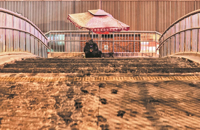 3月4日晚上11時36分,北京一過街天橋上,在雪夜執(zhí)勤的保安。本報記者 楊登峰 攝