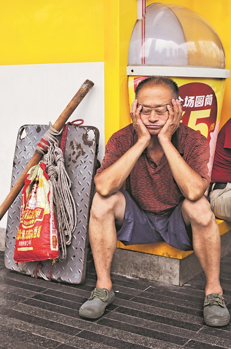 2025年7月20日,重慶,一位在路邊閉目休息的“棒棒”?!鞍舭簟笔侵笐{借一根竹棒和繩索,在重慶從事人力搬運工作的勞動者。他們大多來自周邊農(nóng)村,憑著一身力氣在重慶的大街小巷攬活,通過自己的勞動掙一份辛苦錢。本報記者 楊登峰 攝