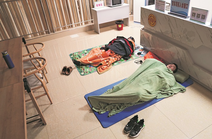 3月19日,河北石家莊,趙佗路街道明珠花苑工會驛站內(nèi),外賣騎手利用訂單間隙打盹補覺。本報通訊員 楊磊濤 攝