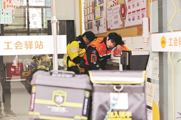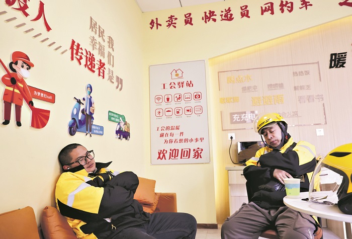 3月18日下午,安徽省淮北市相王廣場,外賣騎手在工會驛站小憩。近年來,淮北市總工會為戶外勞動者提供多元有效、貼心細致的暖心服務(wù),已建成工會驛站370家,初步形成戶外勞動者“15分鐘暖心服務(wù)圈”。本報通訊員 張鋒 攝