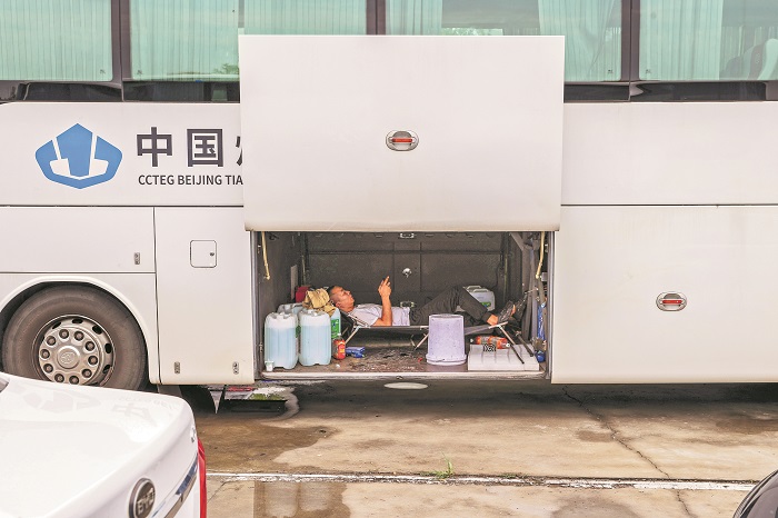 2025年7月10日,北京一停車場內(nèi),等候乘客的大巴車司機在貨倉內(nèi)避暑休息。本報記者 吳凡 攝