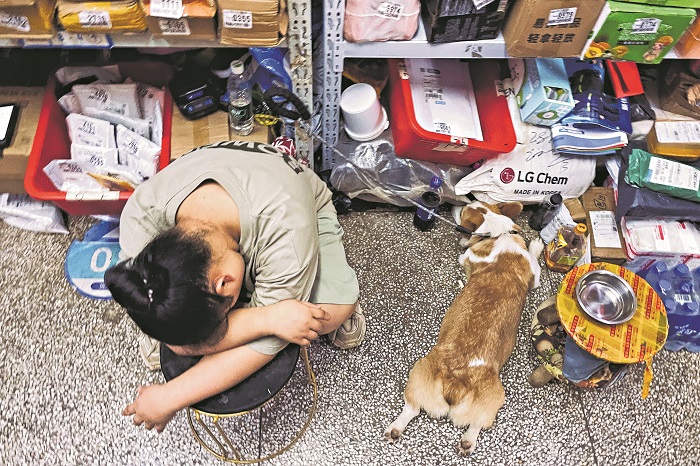 2024年8月30日,江蘇南京鼓樓區(qū)一菜鳥驛站內(nèi),工作人員和她的小狗一起午休。本報記者 劉金夢 攝