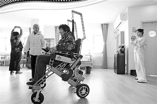 在智慧康養(yǎng)機器人養(yǎng)老驛站內(nèi),一名社區(qū)居民(前)體驗一款智能行走機器人(3月18日攝)。