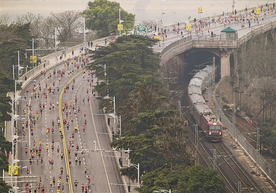 3月22日,武漢馬拉松參賽選手經(jīng)過(guò)武漢長(zhǎng)江大橋。新華社記者 伍志尊 攝