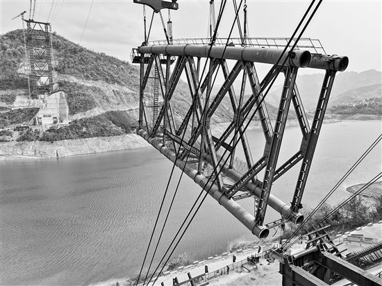 3月21日,黃百鐵路紅水河鐵路大橋首節(jié)拱肋在進(jìn)行吊裝。該橋位于黔桂交界處,橫跨紅水河,全長約1022米,主跨達(dá)570米,是全線控制性工程。