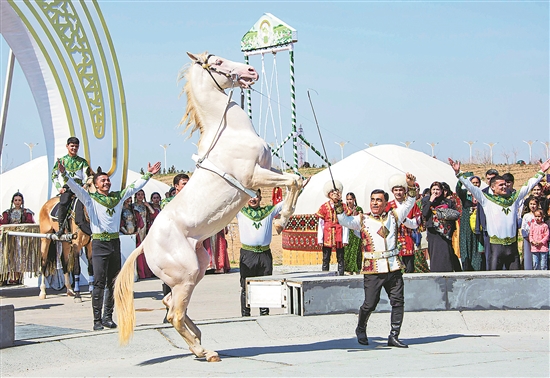 諾魯孜節(jié)是多個(gè)中亞國(guó)家的重要傳統(tǒng)節(jié)日之一,標(biāo)志著春天的到來(lái)和新的一年開(kāi)始。這是近日在土庫(kù)曼斯坦阿哈爾州拍攝的諾魯孜節(jié)慶?;顒?dòng)上的馬術(shù)展演。新華社發(fā)