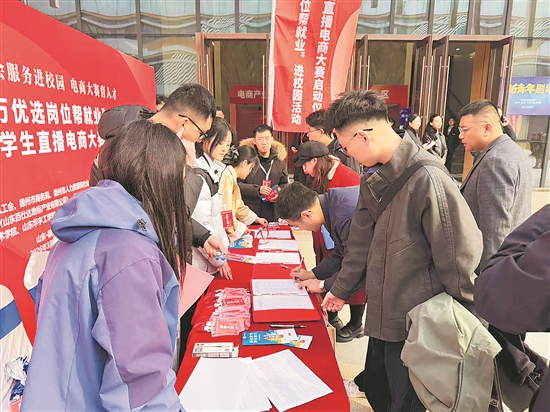 3月17日,山東省總工會在德州市啟動“十萬優(yōu)選崗位幫就業(yè)”進校園活動?;顒友?40家企業(yè)現(xiàn)場招聘,吸引5所高校1000余名應(yīng)屆畢業(yè)生現(xiàn)場求職。招聘同時在全總“職工之家”APP線上直播。本報記者 田國壘 攝