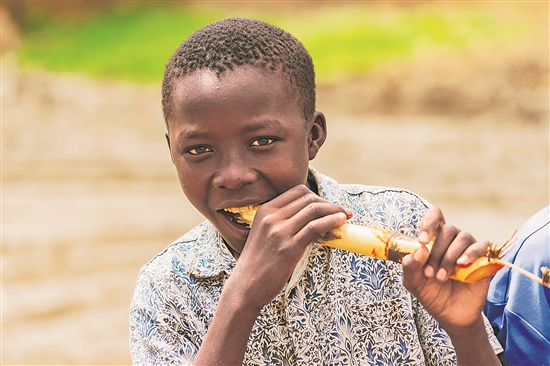 近日,一名男孩在肯尼亞基蘇木郡的甘蔗田旁吃甘蔗。新華社記者 謝劍飛 攝