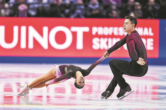 中國(guó)組合張嘉軒(左)/黃一航在雙人滑短節(jié)目比賽中。他們順利晉級(jí)自由滑。
