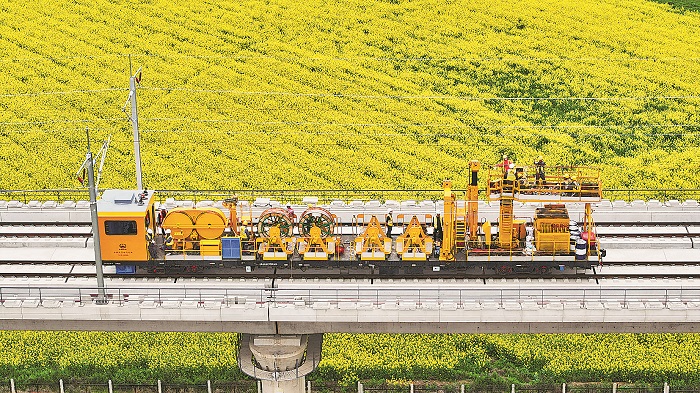3月28日,中國鐵路南昌局南昌供電段的技術人員和中鐵武漢電氣化局的施工人員在京港高鐵昌九段廬山南站至共青城東站區(qū)間架設首條接觸網(wǎng)導線。