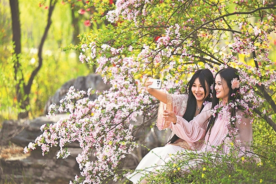 3月31日,游客在河北省石家莊市植物園拍照游玩。