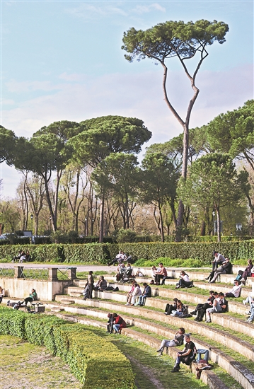 意大利首都羅馬近日氣溫回暖,春意漸濃,人們紛紛走出家門,樂享周末。圖為近日,人們?cè)谝獯罄锥剂_馬的博爾蓋塞公園休閑。