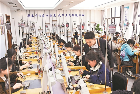 圖為青島幼兒師范高等??茖W(xué)校學(xué)生在課堂上練習(xí)珠寶加工技巧。