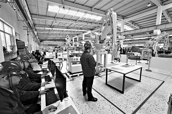 圖為參賽選手正在進行工業(yè)機器人視覺協(xié)同編程調(diào)試項目比賽。
