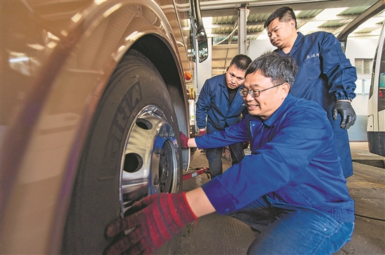 4月1日,浙江省金華國際陸港集團通濟長運汽車維修公司車間里,浙江省勞模包淳戩(圖中)正給學(xué)徒傳授輪胎維保技能。