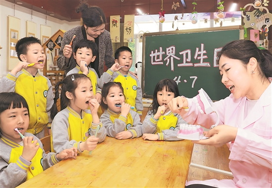 4月7日,湖北省武漢市江岸區(qū)快樂天使幼兒園老師為小朋友們示范正確的刷牙方式。當(dāng)日是世界衛(wèi)生日,國家衛(wèi)生健康委將今年中國宣傳主題確定為“共享科技創(chuàng)新,攜手共促健康”。新華社發(fā) (趙軍 攝)