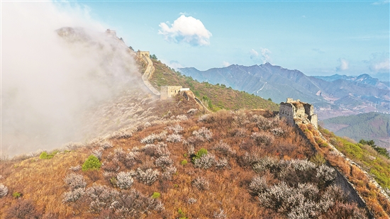 這是4月10日在河北省遷安市拍攝的雨后古長(zhǎng)城晨景(無(wú)人機(jī)照片)。新華社發(fā)(劉滿(mǎn)倉(cāng) 攝)