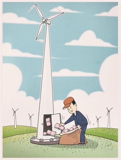 然而,當(dāng)我們把目光收得再嚴(yán)肅一些,就會把焦點(diǎn)集中于漫畫題目中這個“風(fēng)”字上。眾所周知,風(fēng)能具有清潔、環(huán)境友好、可再生等優(yōu)勢。發(fā)展和普及以風(fēng)電為代表的清潔能源,事關(guān)物質(zhì)文明和生態(tài)文明的協(xié)調(diào)發(fā)展。此外,和其他類型清潔能源不同,分布于山巒和田野中的風(fēng)輪,本身也是令人賞心悅目的風(fēng)景。令人自豪的是,有數(shù)據(jù)顯示,中國風(fēng)力發(fā)電排名世界第一,這足以說明,清潔能源在我們這個古老的國度,已然成為風(fēng)尚。