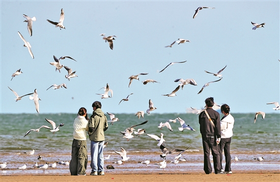 4月7日,游客在河北省秦皇島市北戴河區(qū)沿海地區(qū)觀看海鷗飛舞。