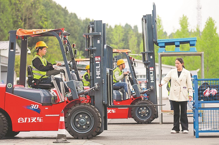 4月12日,貴州畢節(jié)黔西市杜鵑街道岔白社區(qū)叉車培訓(xùn)基地里,學(xué)員在老師的指導(dǎo)下進(jìn)行叉車技能培訓(xùn)。