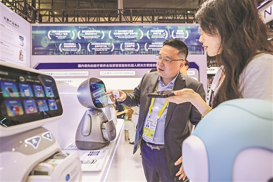 4月13日,參觀者在第六屆消博會主會場了解智能機器人產(chǎn)品。