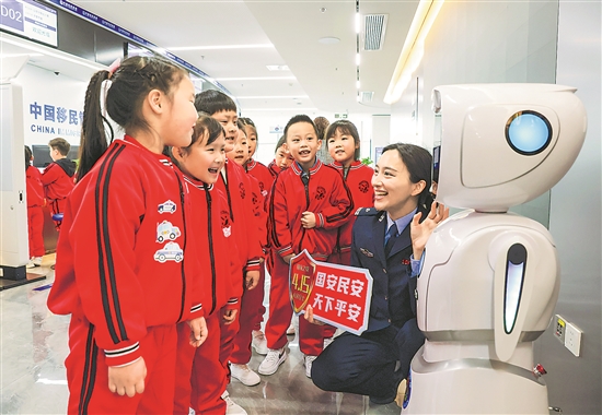 4月13日,在江蘇省揚(yáng)州市公安局江都分局出入境管理大隊(duì),揚(yáng)州市江都區(qū)一幼兒園的小朋友們通過與機(jī)器人對(duì)話了解出入境安全知識(shí)。今年4月15日是第十一個(gè)全民國(guó)家安全教育日,各地開展形式多樣的主題宣傳教育活動(dòng),提高人們的國(guó)家安全意識(shí)。