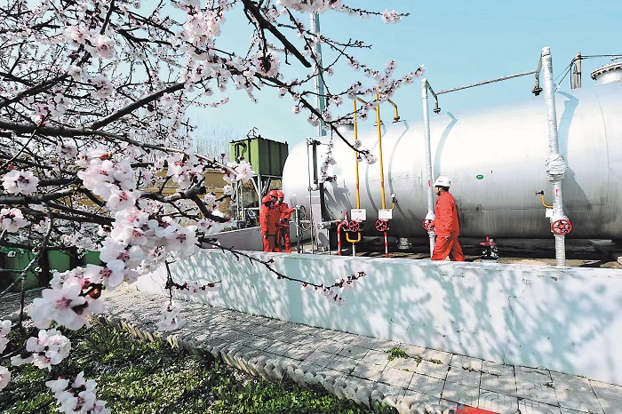 圖為4月10日該廠東濮采氣區(qū)三號集氣站職工在桃花叢中查看污油存儲技術(shù)改進措施落實情況。