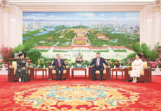 4月15日下午,中共中央總書記、國家主席習(xí)近平和夫人彭麗媛在北京人民大會堂同來華進(jìn)行國事訪問的越共中央總書記、國家主席蘇林和夫人吳芳璃親切話別。新華社記者 李響 攝
