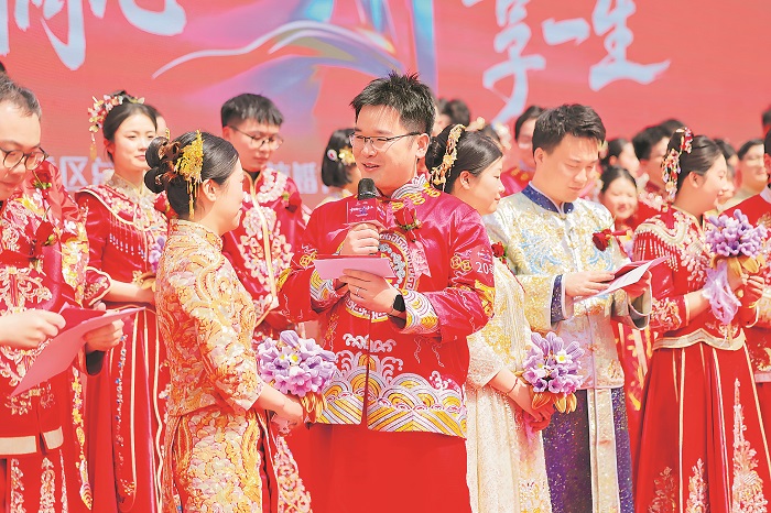 4月12日,正值泡桐花浪漫綻放之際,以“AI享一生”為主題的北京經(jīng)開區(qū)職工集體婚禮、北汽新能源第五屆青年集體婚禮在博大公園舉辦。28對新人身著中式婚服攜手登場,在爛漫花海中許下愛的誓言。本報記者 賴志凱 本報通訊員 何欣 攝