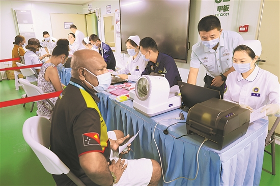 近日,執(zhí)行“和諧使命-2025”任務(wù)的中國(guó)海軍“絲路方舟”號(hào)醫(yī)院船在巴布亞新幾內(nèi)亞開展醫(yī)療服務(wù)。這是醫(yī)院船掛號(hào)處。新華社發(fā)(崔曉洋 攝)