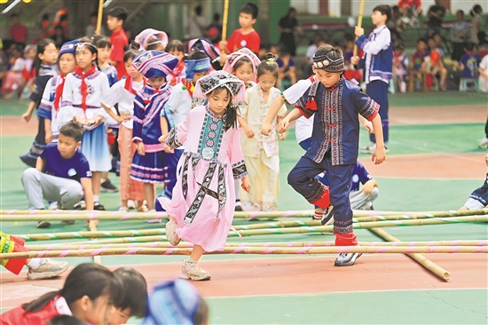 4月16日,在廣西壯族自治區(qū)梧州市龍圩中心小學(xué)集團(tuán)舉行的“三月三”民族團(tuán)結(jié)主題實(shí)踐活動(dòng)中,小學(xué)生們?cè)谔窀臀琛?/p>
