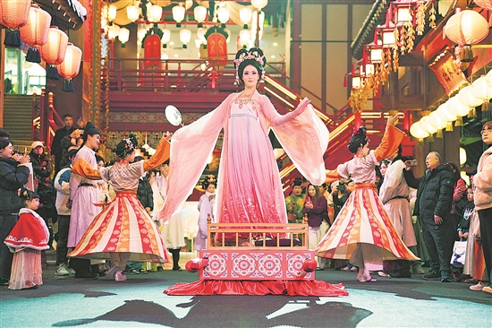 在西安長安十二時辰主題街區(qū),演員以唐詩中的楊貴妃為主題進行沉浸式表演(2025年12月23日攝)。