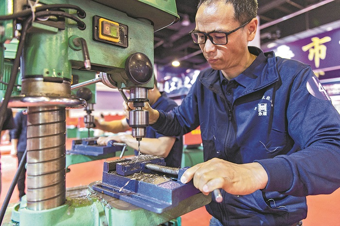 4月10日,浙江省永康市國際會展中心里,參賽選手在進(jìn)行模具工(沖壓模)職業(yè)技能競賽。