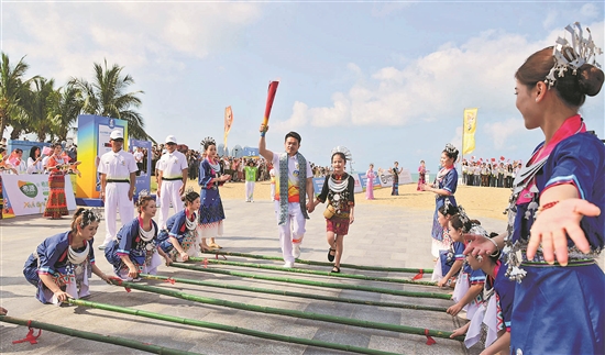 火炬手石智勇(中左)在此前舉行的三亞亞沙會火炬?zhèn)鬟f活動(dòng)中。新華社記者 楊冠宇 攝